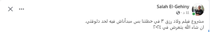 وكتب صلاح الجهيني عبر حسابه الشخصي على فيسبوك، الآتي: مشروع فيلم ولاد رزق 3 في خطتنا بس مبدأناش فيه لحد دلوقتي.. إن شاء الله يتعرض في 2024.