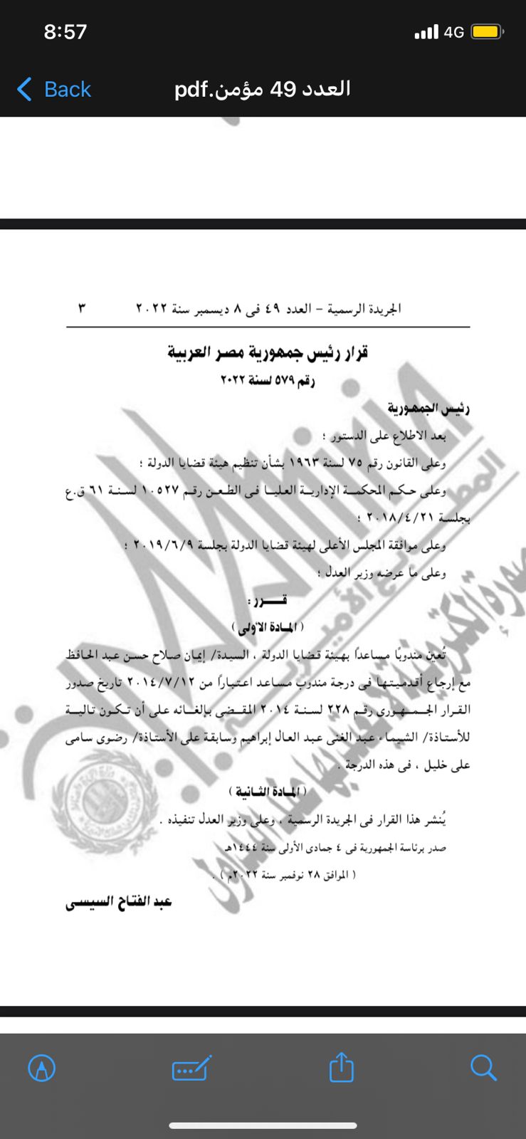 قرار جمهوري بتعيين إيمان عبد الحافظ مندوبًا مساعدًا بهيئة قضايا الدولة