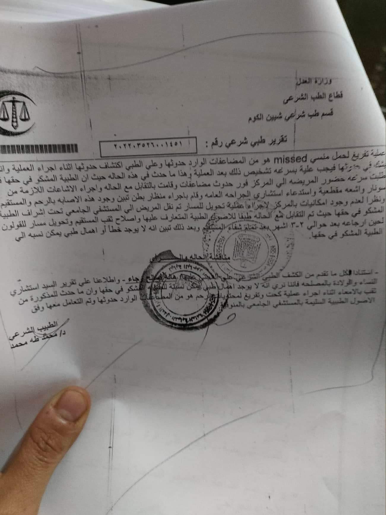 وأضاف التقرير: كما أن الطبيبة استدعت استشاري وقام بإجراء منظار على البطن، حيث تبين وجود الإصابة في الرحم والمستقيم، ونظرا لعدم وجود إمكانيات داخل المركز لإجراء تلك العملية؛ جرى نقل المريضة إلى المستشفى الجامعي بشبين الكوم تحت إشراف الطبيبة المشكو في حقها، وجرى إجراء الجراحة الطبية وفق الأصول الطبية المتعارف عليها.