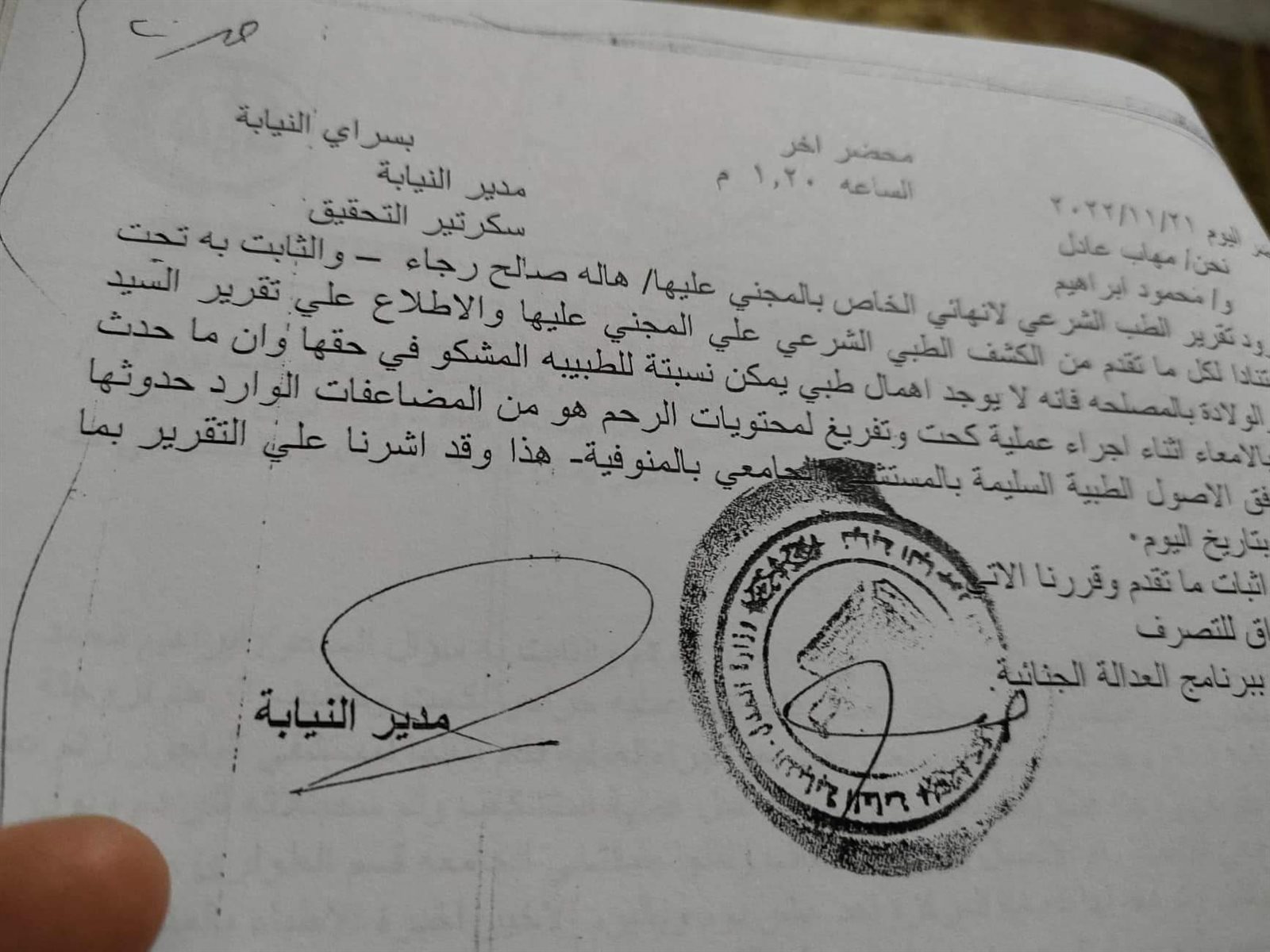 مستند الطب الشرعي بالمنوفية حول واقعة الإهمال الطبي لمريضة