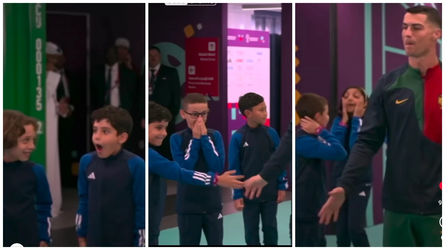 تفاجئ أحد الأطفال بقيام نجم المنتخب البرتغالي كريستيانو رونالدو بمصافحته قبل بداية مباراته في دور المجموعات بكأس العالم، ورصد الكاميرا رد فعل الطفل، الذي لم يصدق أنه صافح الدون.