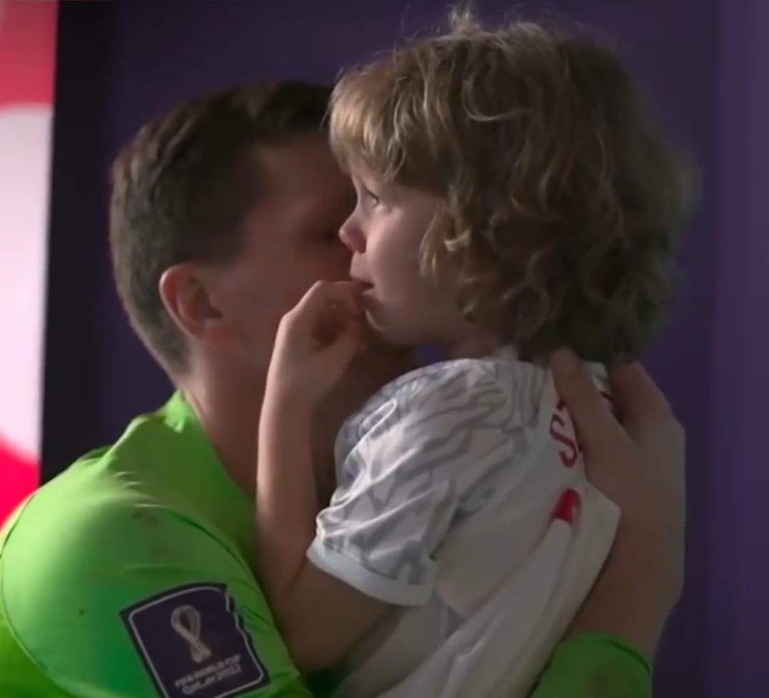 تشيزني حارس المنتخب البولندي يحاول إقناع نجله بالتوقف عن البكاء