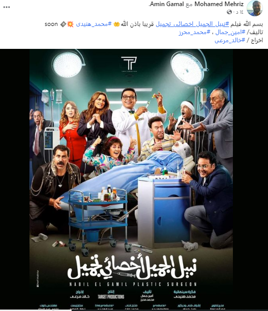 ونشر مؤلف الفيلم الكاتب محمد محرز صورة البوستر الرسمي للفيلم وعلق عليها قائلا: بسم الله الرحمن الرحيم.. فيلم دكتور نبيل الجميل أخصائي تجميل قريبا.. بطولة الفنان محمد هنيدي.