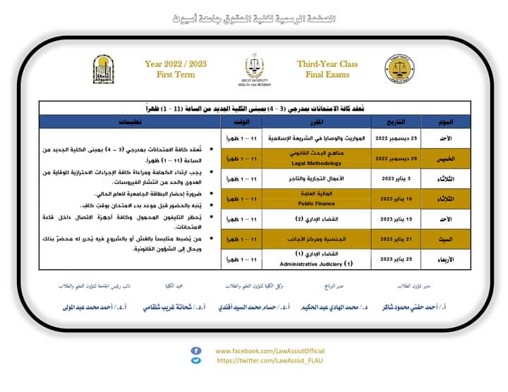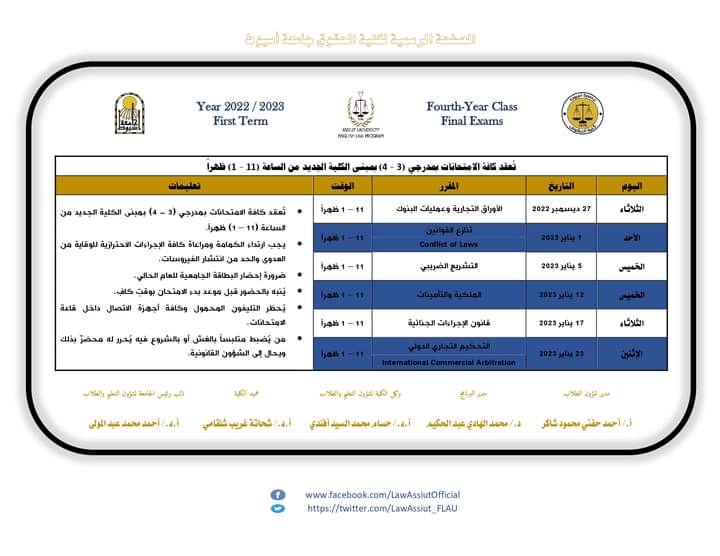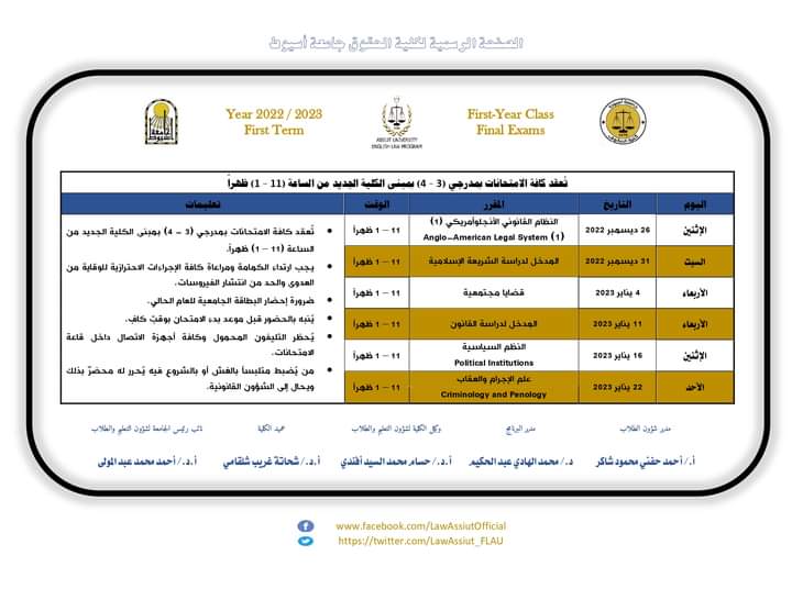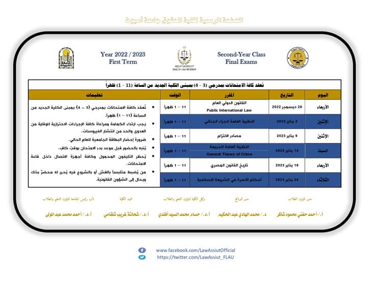 ننشر جداول امتحانات الفصل الدراسي الأول لكلية الحقوق برنامج اللغة الإنجليزية بجامعة أسيوط