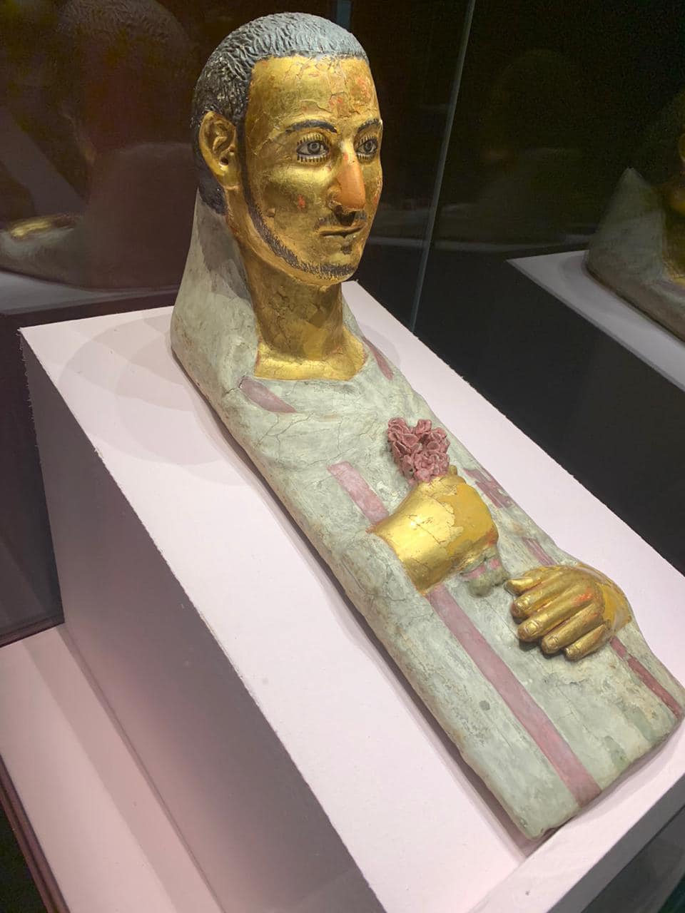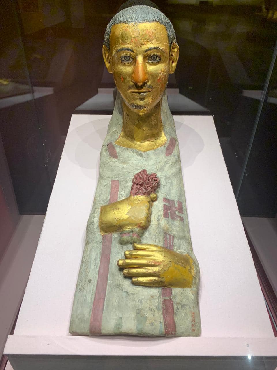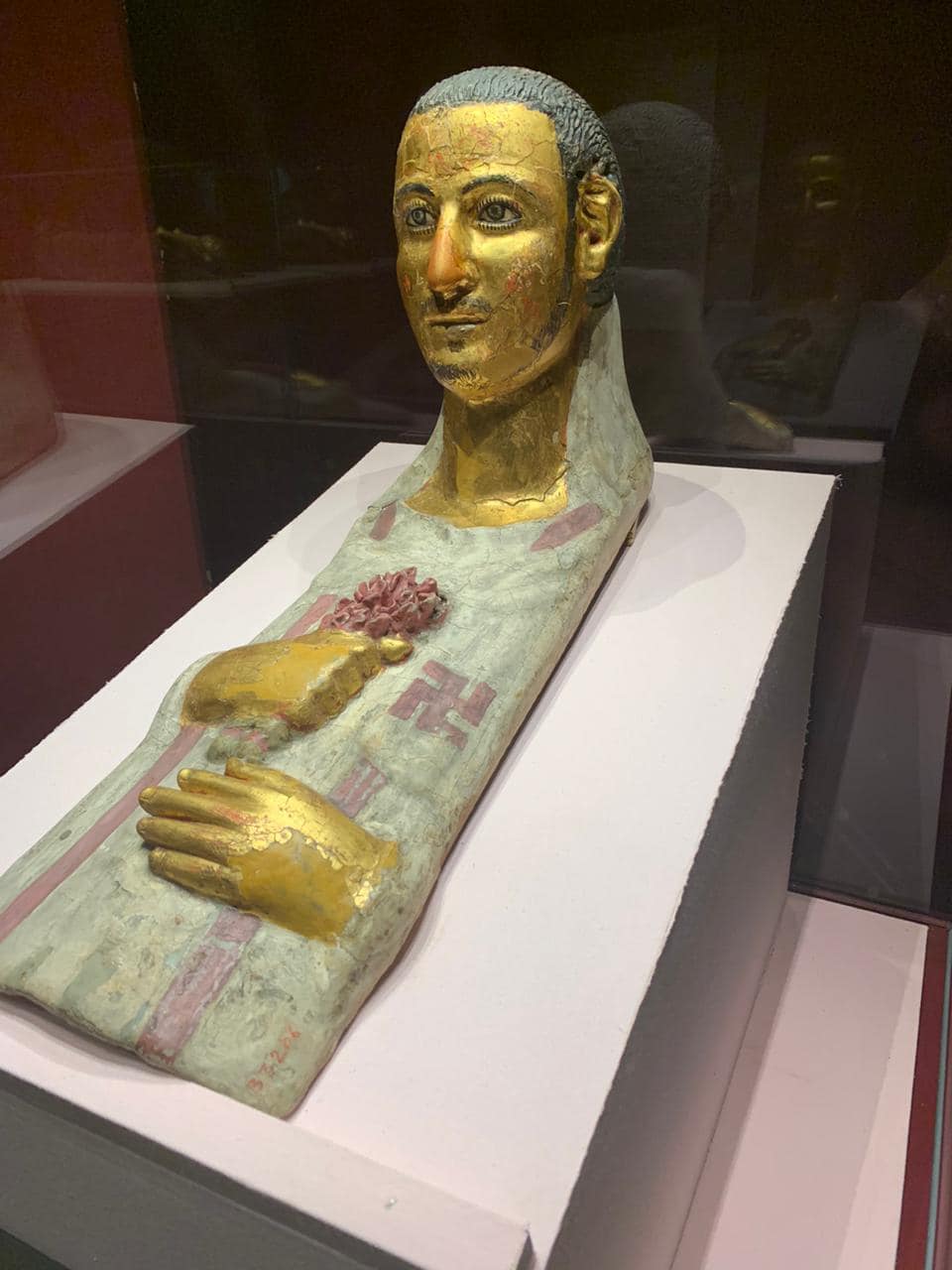 يعرض متحف آثار الغردقة غطاء تابوت، يعود إلى القرن الثالث الميلادي، العصر الروماني، وصُنع من الخشب المذهب والقماش.