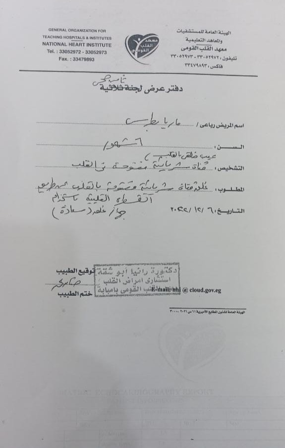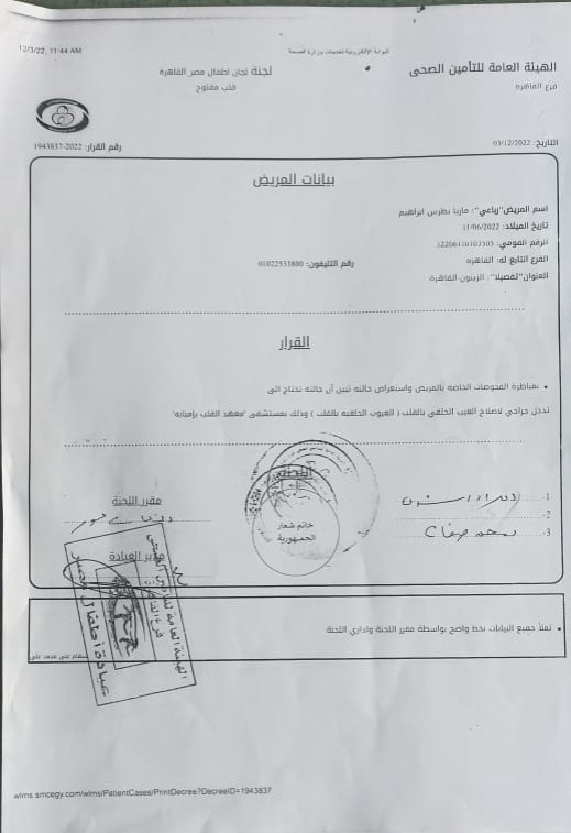 وقال بطرس إبراهيم، إن ابنته تعاني من مشاكل صحية في القلب وبالفحص تبين أنها تعاني تضخم في القلب نتيجة وجود وصلة شريانية مفتوحة وثقب، بحسب تشخيص أطباء معهد القلب.