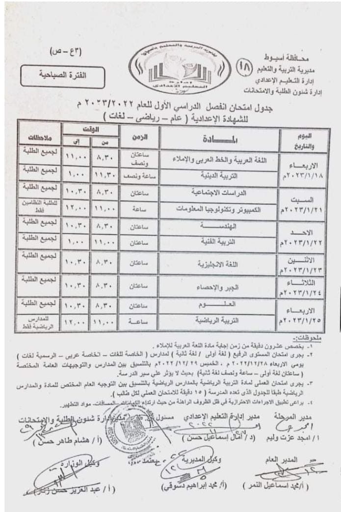 جدول امتحان الفصل الدراسي الأول للشهادة الإعدادية بأسيوط