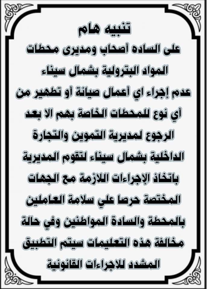 أعلنت مديرية التموين والتجارة الداخلية بمحافظة شمال سيناء تنبيهات على أصحاب محطات الوقود في مدينة العريش بعدم إجراء أي صيانة أو تطهير لخزانات الوقود بالمحطات إلا بعد إبلاغ مديرية التموين واتخاذ الإجراءات اللازمة.