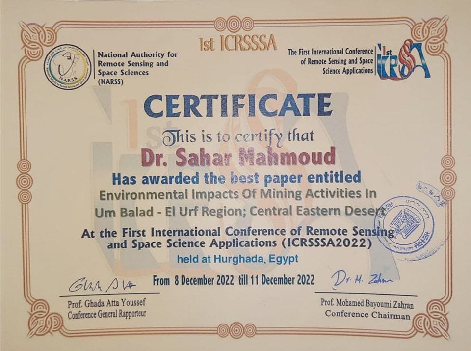 وقد حصلت الدكتورة سحر محمود عبد الباقي أحمد، مدرس الجيولوجيا بقسم العلوم البيولوجية والجيولوجيا بكلية التربية جامعة عين شمس، على جائزة أفضل بحث بعنوان "التأثيرات البيئية لأنشطة التعدين في منطقة أم بلد العرف وسط الصحراء الشرقية" وتم تكريمها من محمد بيومي زهران، رئيس الهيئة القومية للاستشعار من البعد وعلوم الفضاء، ورئيس المؤتمر، وغادة عطا نائب رئيس الهيئة القومية للاستشعار من البعد وعلوم الفضاء لشئون ريادة الأعمال وخدمة المجتمع ومقرر المؤتمر.