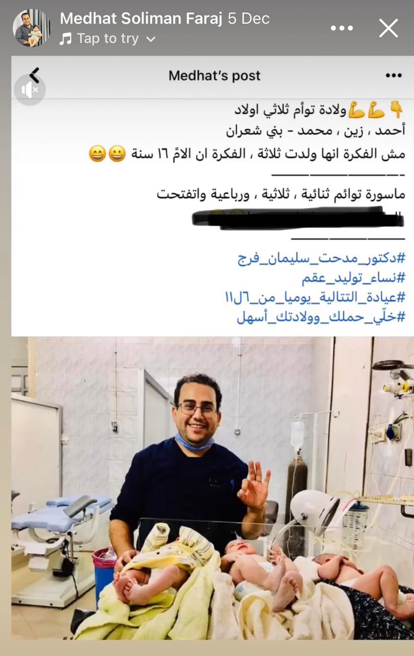 نشر دكتور مدحت على صفحته الشخصية بوست يقول فيه: ولادة توأم ثلاثي أولاد، أحمد، زين، ومحمد، مش الفكرة إنها ولدت ثلاثة، الفكرة إن الأم 16 سنة، ليتابع ساخرًا ماسورة توائم ثلاثية.