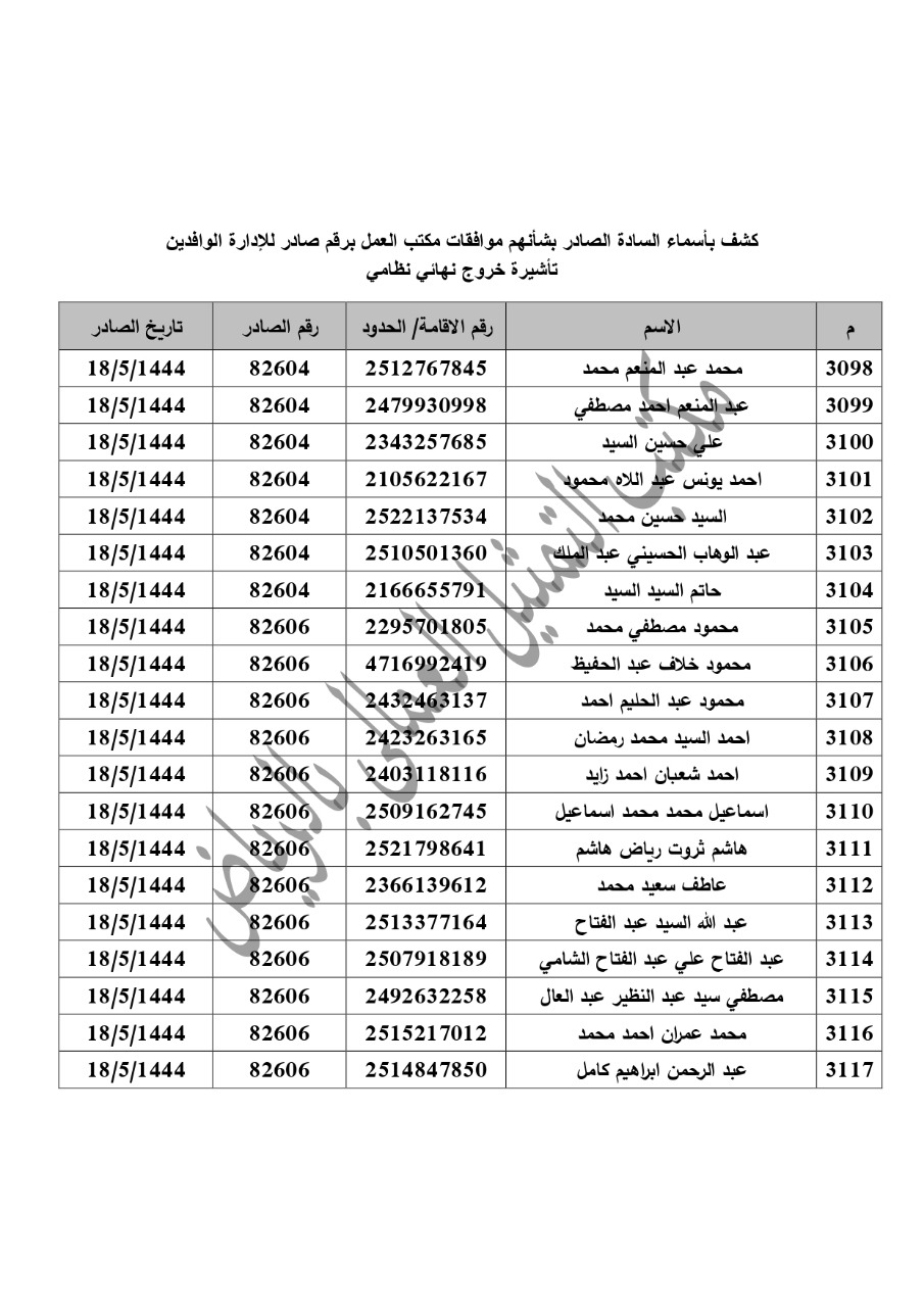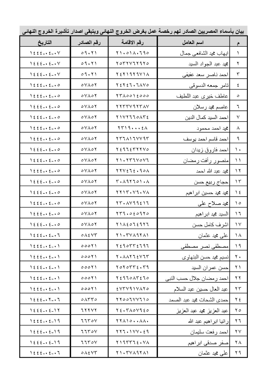 وجاء في تقرير تلقاه الوزير حسن شحاتة وزير القوى العاملة، من وليد عبد الرازق رئيس مكتب التمثيل العمالي بجدة، قال فيه انه تمت الموافقة، الانتهاء من 29 طلب من أصل 134 لإصدار رخصة عمل بغرض الخروج النهائي، وقال إنه تم التنسيق الكامل مع القسم القنصلى لمتابعة إصدار تأشيرة الخروج النهائى من ادارة الوافدين وعودة تلك العمالة إلى مصر، موضحًا أن الطلبات المتبقية، وعددها 105 طلبًا تحت الفحص الآن.