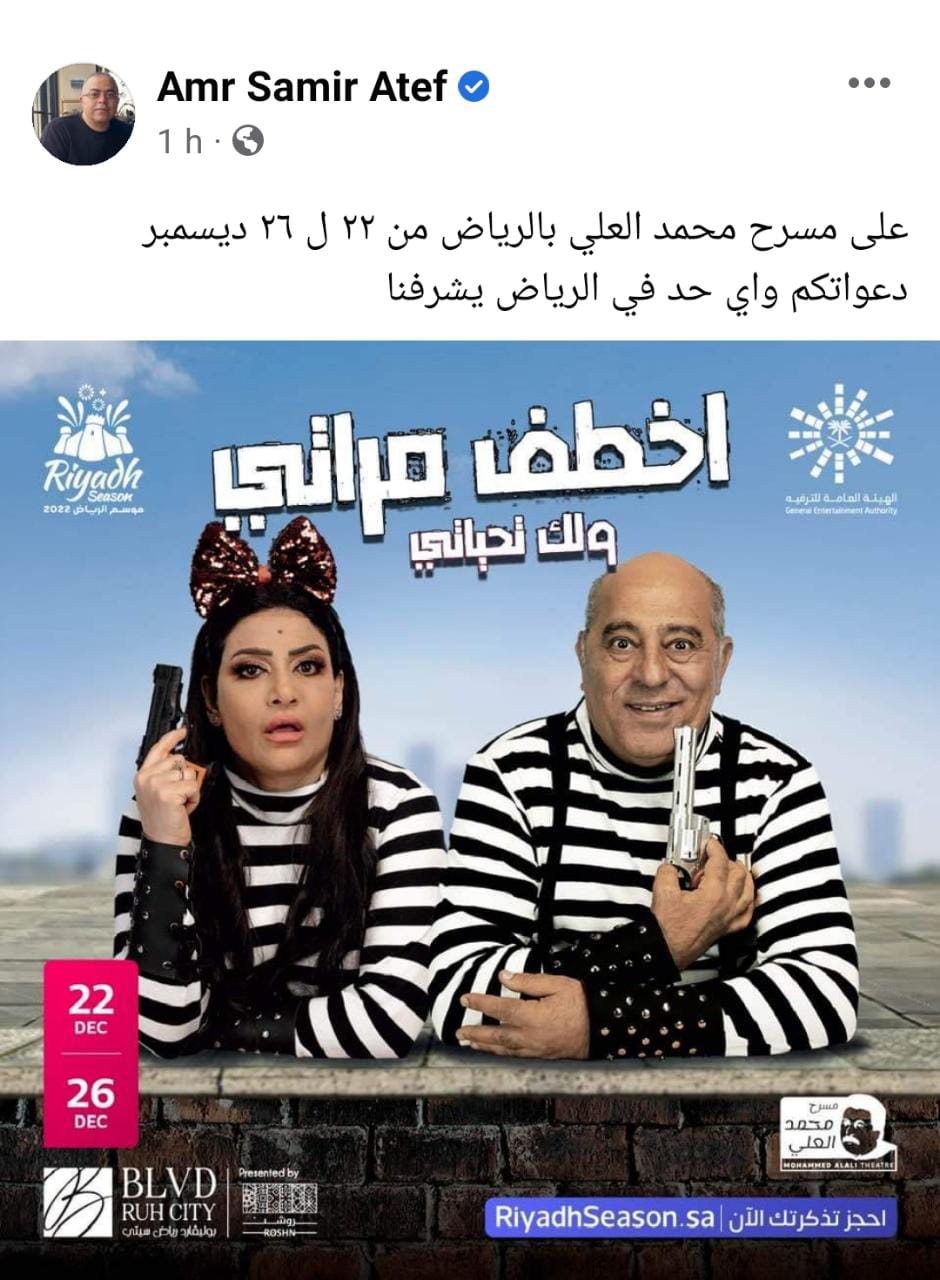 ونشر عمرو سمير عاطف، البوستر عبر حسابه الشخصي بموقع التواصل الاجتماعي فيس بوك، وظهر على البوستر الفنان إسماعيل فرغلي والفنانة بدرية طلبة، وعلق قائلًا: على مسرح محمد العلي بالرياض من 22 لـ 26 ديسمبر، دعواتكم وأي حد في الرياض يشرفنا.