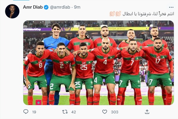 في سياق متصل، دعم الفنان عمرو دياب منتخب المغرب بعد خسارته في مباراة نصف نهائي بطولة كأس العالم قطر 2022، قائلًا: أنتم فخر لنا، شرفتونا يا أبطال.