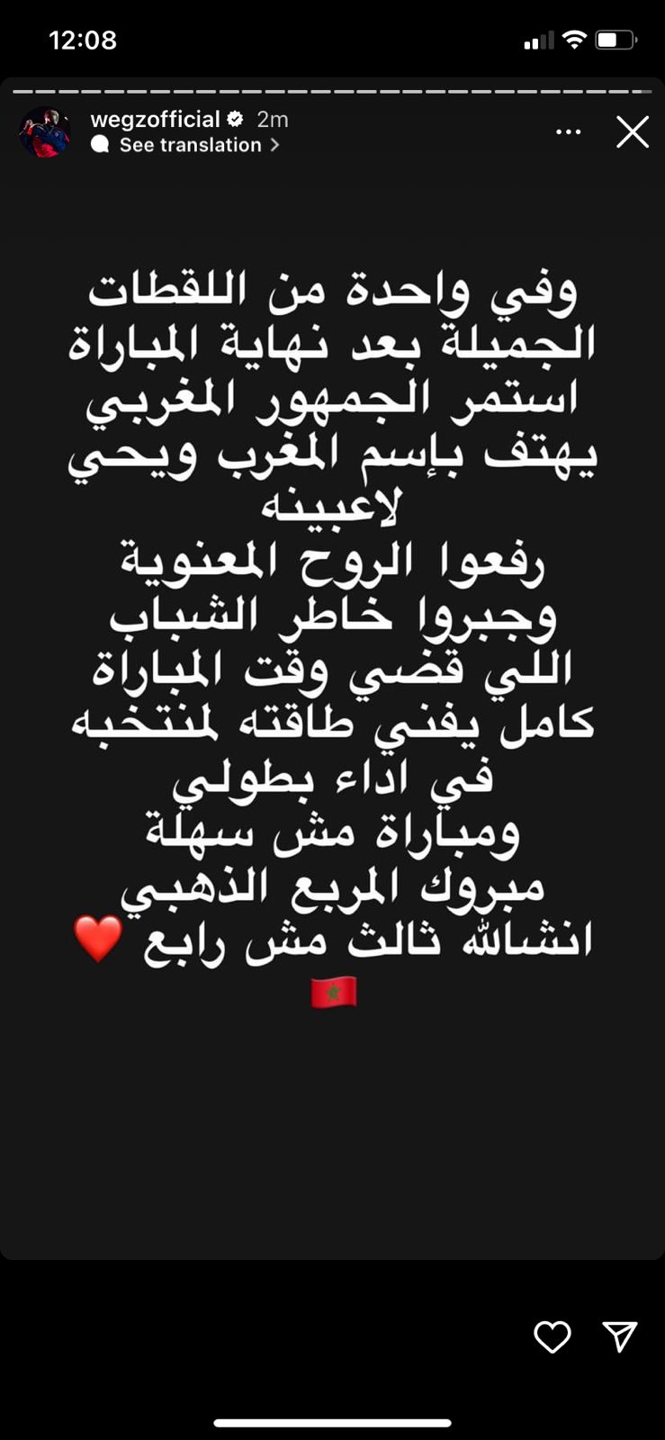 ونشر مغني الراب ويجز ستوري عبر حسابه الشخصي انستجرام كتب فيها: في واحدة من اللقطات الجميلة بعد نهاية المبارة الجمهور المغربي يهتف باسم المغرب ويحي لاعبينه.