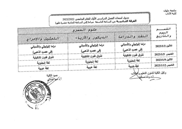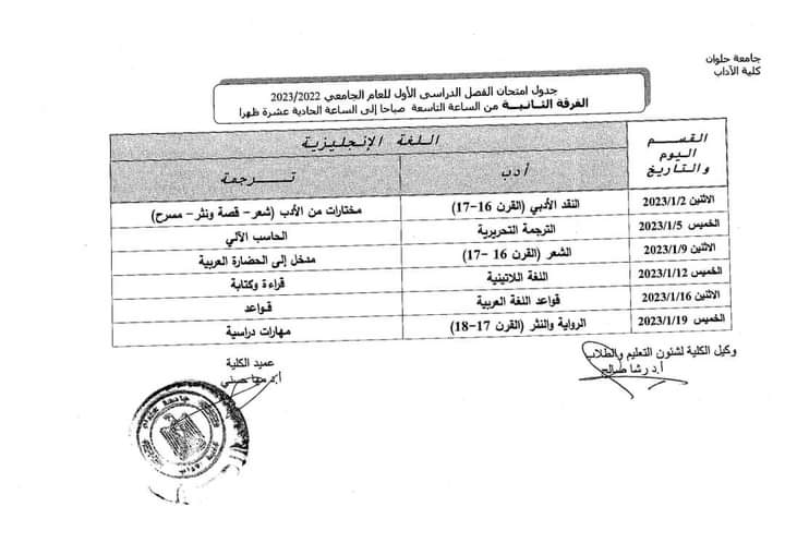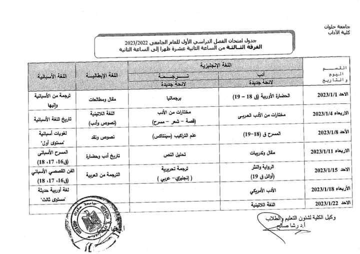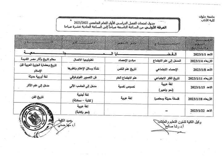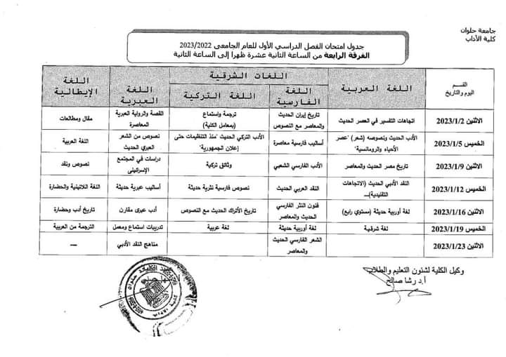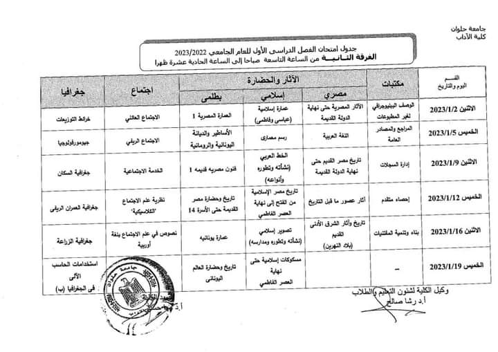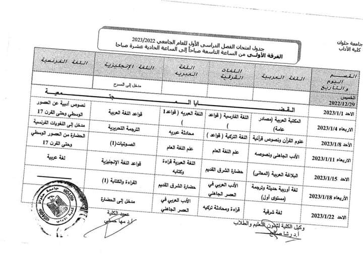 جداول امتحانات الفصل الدراسي الأول لطلاب كلية الأداب بـ جامعة حلوان |صور
