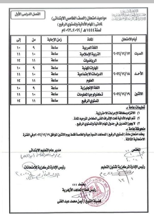وأعلنت المنطقة الأزهرية أن اليوم السبت سيتم عقد مهمة أدائية في اللغة العربية، ومهمة في التربية الإسلامية ومهمة في الرياضيات اعتبارا من التاسعة صباحا وحتى زمن الخروج الثانية عشر ظهرًا.