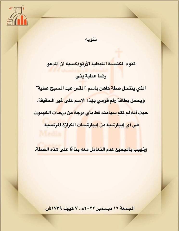 الكنيسة القبطية الأرثوذكسية تحذر من شخص ينتحل صفة كاهن يدعى القس عبد المسيح عطية