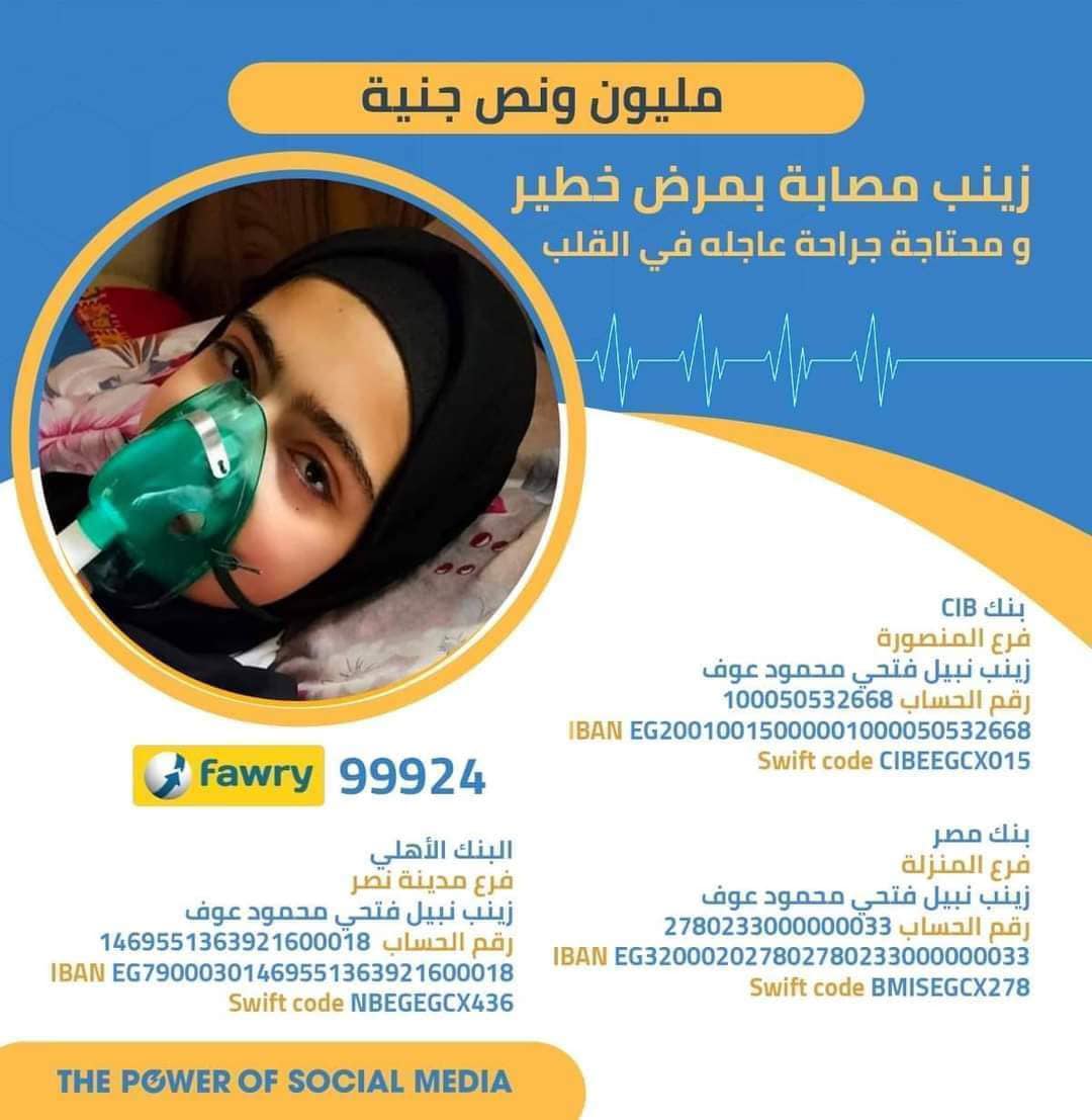 يذكر أنه خلال الفترة الماضية، ضجت وسائل التواصل الاجتماعي بحالة الفتاة التي تسمي زينب، والتي تعاني من مشكلة في القلب والذي أدت إلى حاجتها لزراعة شريان في القلب، خارج البلاد بتكلفة تصل لـ 1.5 مليون جنيه مصري، وقامت العديد من صفحات فيس بوك بنشر قصة زينب لجمع تبرعات لها.