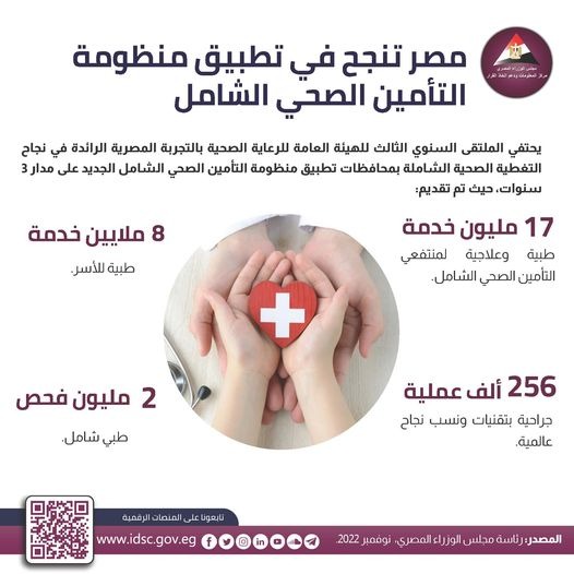 وأوضح إنفوجراف مجلس الوزراء، عبر صفحته على موقع التواصل الاجتماعي، فيسبوك، أن الملتقى السنوي الثالث للهيئة العامة للرعاية الصحية يحتفي بالتجربة المصرية الرائدة في نجاح التغطية الصحية الشاملة بمحافظات تطبيق منظومة التأمين الصحي الشامل الجديد، وإنجازات هيئة الرعاية الصحية في ضبط وتنظيم تقديم خدمات الرعاية الصحية المتكاملة للمنتفعين بأعلى معايير الجودة العالمية، والإشادات العربية والدولية التي حصدتها على مدار 3 سنوات، وذلك بمحافظات تطبيق المنظومة "بورسعيد، والأقصر، والإسماعيلية، وجنوب سيناء"، وفق الممارسات الطبية العالمية، علاوة على استحداث العديد من الخدمات الطبية والعلاجية داخل نطاق المحافظات.