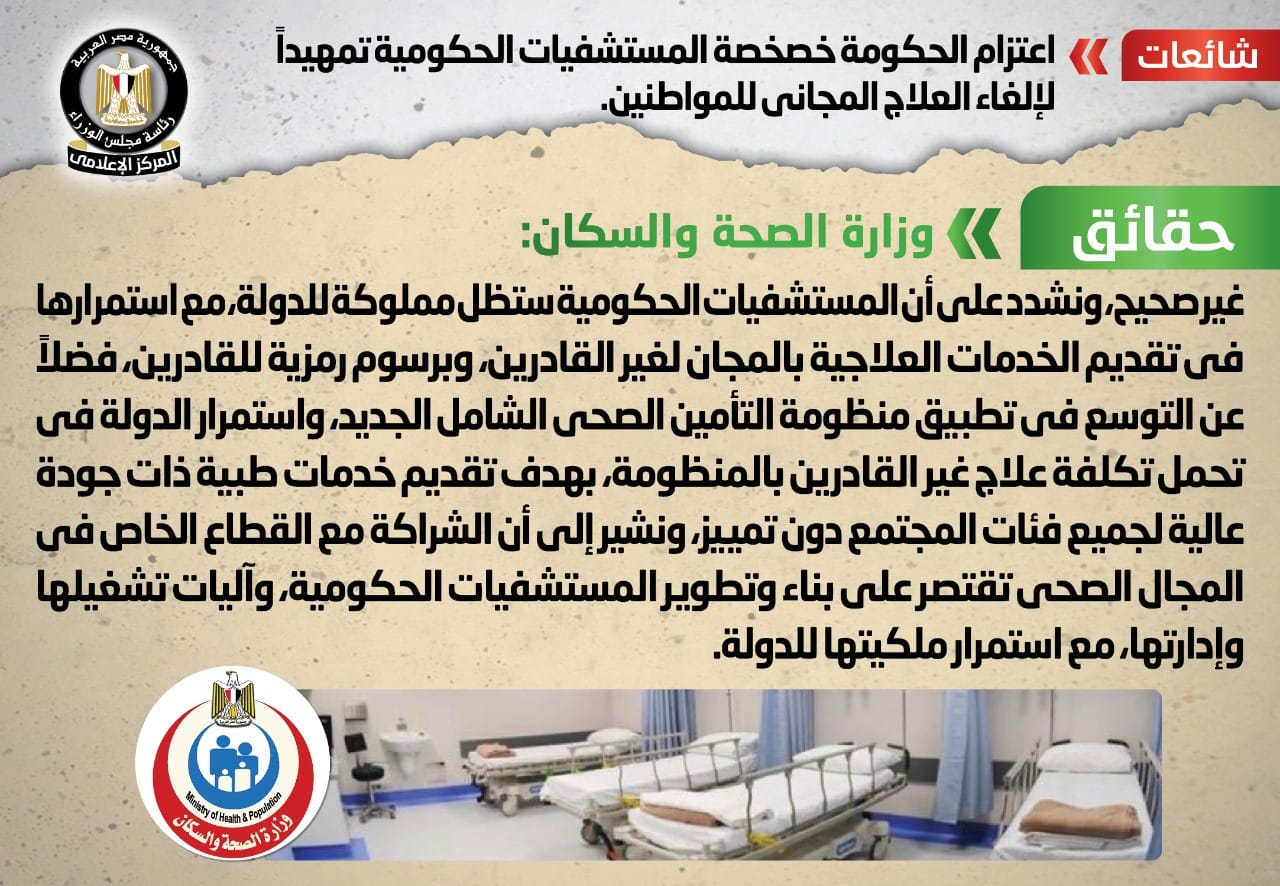 وشددت وزارة الصحة والسكان، على أن المستشفيات الحكومية ستظل مملوكة للدولة، مع استمرارها في تقديم الخدمات العلاجية بالمجان لغير القادرين، وبرسوم رمزية للقادرين، فضلًا عن التوسع في تطبيق منظومة التأمين الصحي الشامل الجديد، واستمرار الدولة في تحمل تكلفة علاج غير القادرين بالمنظومة، بهدف تقديم خدمات طبية ذات جودة عالية لجميع فئات المجتمع دون تمييز، مُشيرةً إلى أن الشراكة مع القطاع الخاص في المجال الصحي تقتصر على بناء وتطوير المستشفيات الحكومية، وآليات تشغيلها وإدارتها، مع استمرار ملكيتها للدولة.