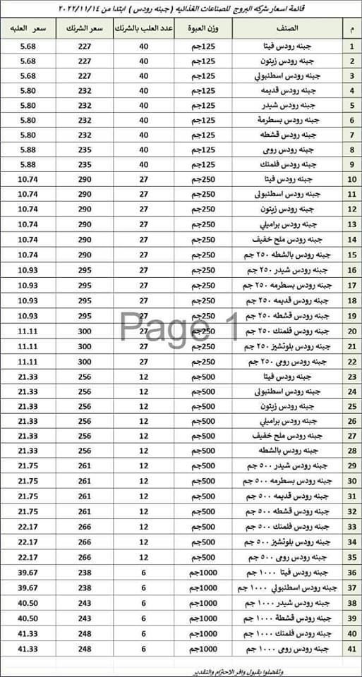 وحسب مستند حصل القاهرة 24 على نسخة منه، مرسل إلى التجار أعضاء الغرف التجارية، بالقائمة الجديدة لأسعار جبنة رودس، أنه ارتفع سعر عبوة جبنة رودس الـ 125 جم، لتصل إلى 7 جنيهات، بدلًَا من 6 جنيهات.
