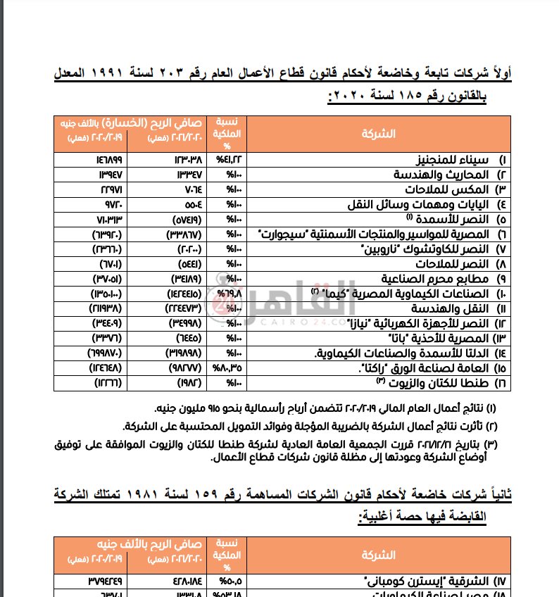 تكبدت 10 شركات تابعة لوزارة قطاع الأعمال العام خسائر تجاوزت 7 مليار جنيه، وفق المستند الذي حصل القاهرة 24 على نسخة منه، والذي يرصد صافي الربح والخسارة للشركات التابعة للشركة القابضة للصناعات الكيماوية، وذلك وفق نتائج أعمال هذه الشركات العام المالي الماضي2021، وهى شركات تابعة وخاضعة لقانون قطاع الأعمال العام رقم 203 لسنة 1991 المعدل بالقانون رقم 185 لسنة 2020.