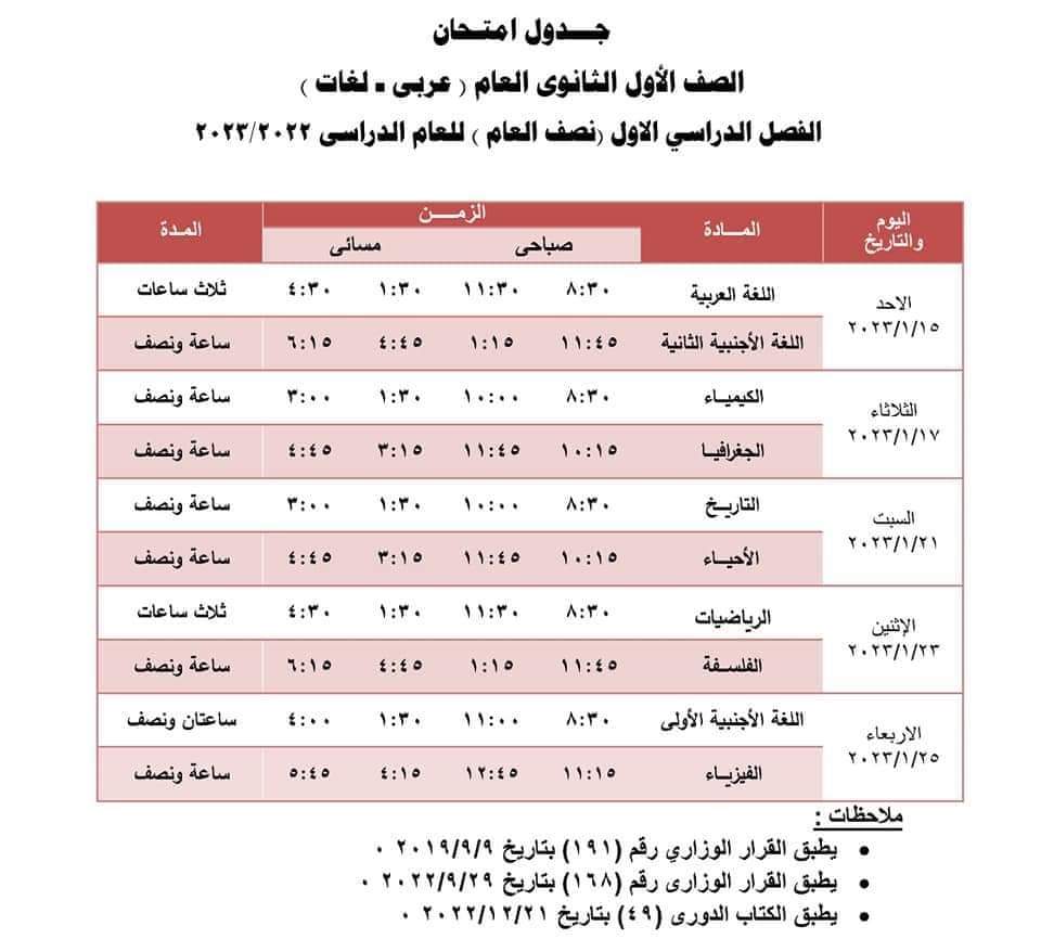 موعد امتحانات الفصل الدراسي الأول للعام الدراسي 2022-2023 للصفين الأول والثاني الثانوي