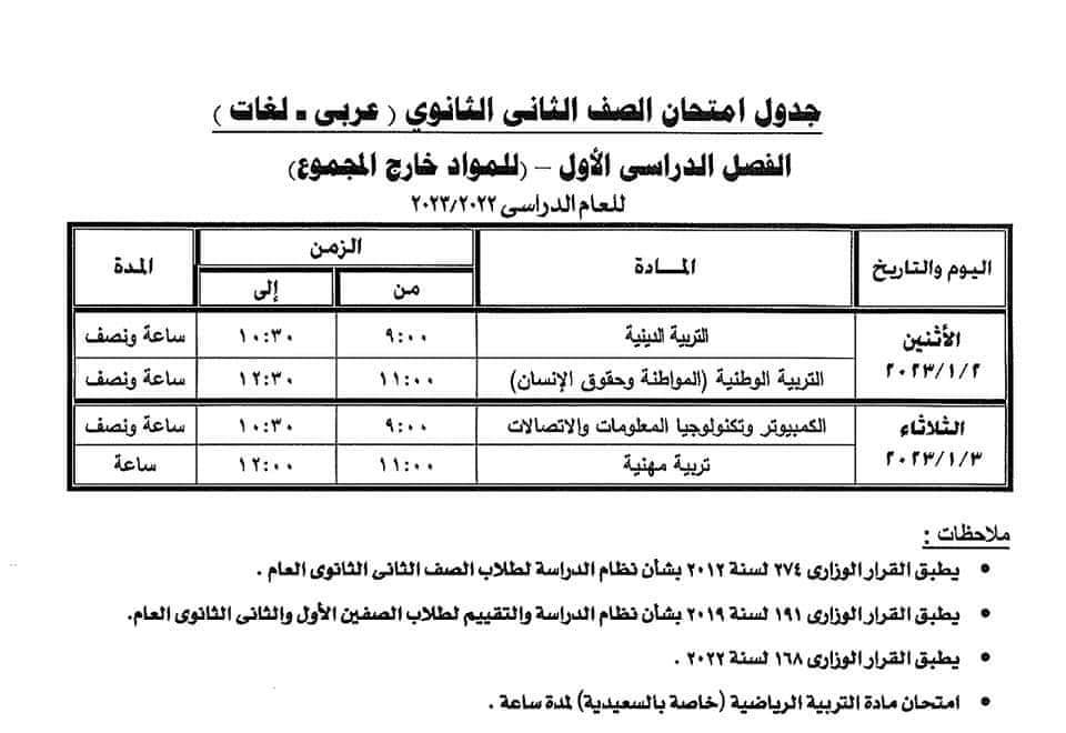 وأكدت الوزارة في خطابها، أنه في حالة حدوث أي مشكلة تقنية بالتابلت في أي مادة يتم أداء الامتحان ورقيًا لهذه المادة في نفس موعد الامتحان المحدد بالجدول، مشيرة إلى أنه يتم إعداد جداول الامتحانات للصفين الأول والثاني الثانوي العام على مستوى المديرية وفقا لما يراه مدير المديرية؛ بحيث تبدأ الامتحانات في 14-1-2023 وتنتهي في 26-1-2023.