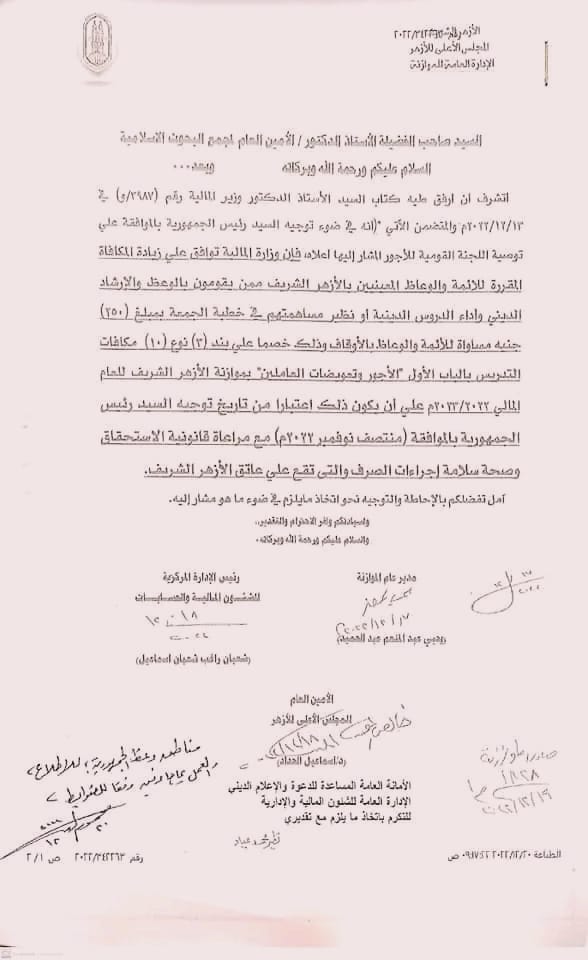 "(إنه في ضوء توجيه رئيس الجمهورية بالموافقة على توصية اللجنة القومية للأجور المشار إليها أعلاه، فإن وزارة المالية توافق على زيادة المكافاة المقررة للأئمة والوعاظ المعينين بالأزهر الشريف ممن يقومون بالوعظ والإرشاد.