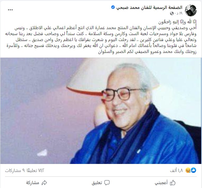 ونشر محمد صبحي، صورة المنتج الراحل محمد عمارة، وذلك عبر حسابه الرسمي بموقع التواصل الاجتماعي فيس بوك، وعلق ناعيًا: إنا لله وإنا إليه راجعون.. أخي وصديقي وحبيبي الإنسان والفنان المنتج محمد عمارة الذي أنتج أعظم أعمالي على الإطلاق.. ونيس وفارس بلا جواد ومسرحيات لعبة الست وكارمن وسكة السلامة.