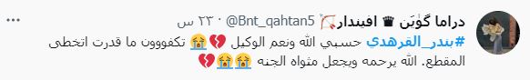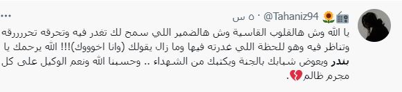 ودعا له حساب آخر بالمغفرة والرحمة قائلًا: بندر القرهدي الله يرحمه ويغفر له ويسكنه فسيح جناته، بينما دعا له حساب آخر، قائلا: الله يرحمك يا بندر ويعوض شبابك بالجنة ويكتبك من الشهداء.. وحسبنا الله ونعم الوكيل على كل مجرم ظالم.