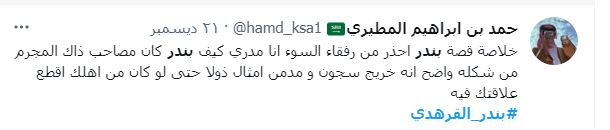 وذكر حساب آخر: خلاصة قصة بندر.. احذر من رُفقاء السوء.. أنا مدري كيف بندر كان مصاحب ذاك المجرم.. من شكله واضح إنه خريج سجون ومدمن أمثال ذولا.. حتى لو كان من أهلك اقطع علاقتك فيه.