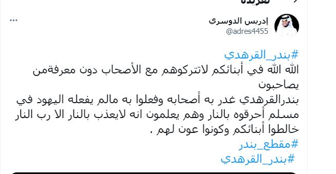كما حذّر حساب آخر من أصدقاء السوء قائلًا: الله الله في أبنائكم لا تتركوهم مع الأصحاب دون معرفة من يصاحبون.. بندرالقرهدي غدر به أصحابه وفعلوا به مالم يفعله اليهود في مسلم.. أحرقوه بالنار وهم يعلمون أنه لا يُعذّب بالنار إلا رب النار.