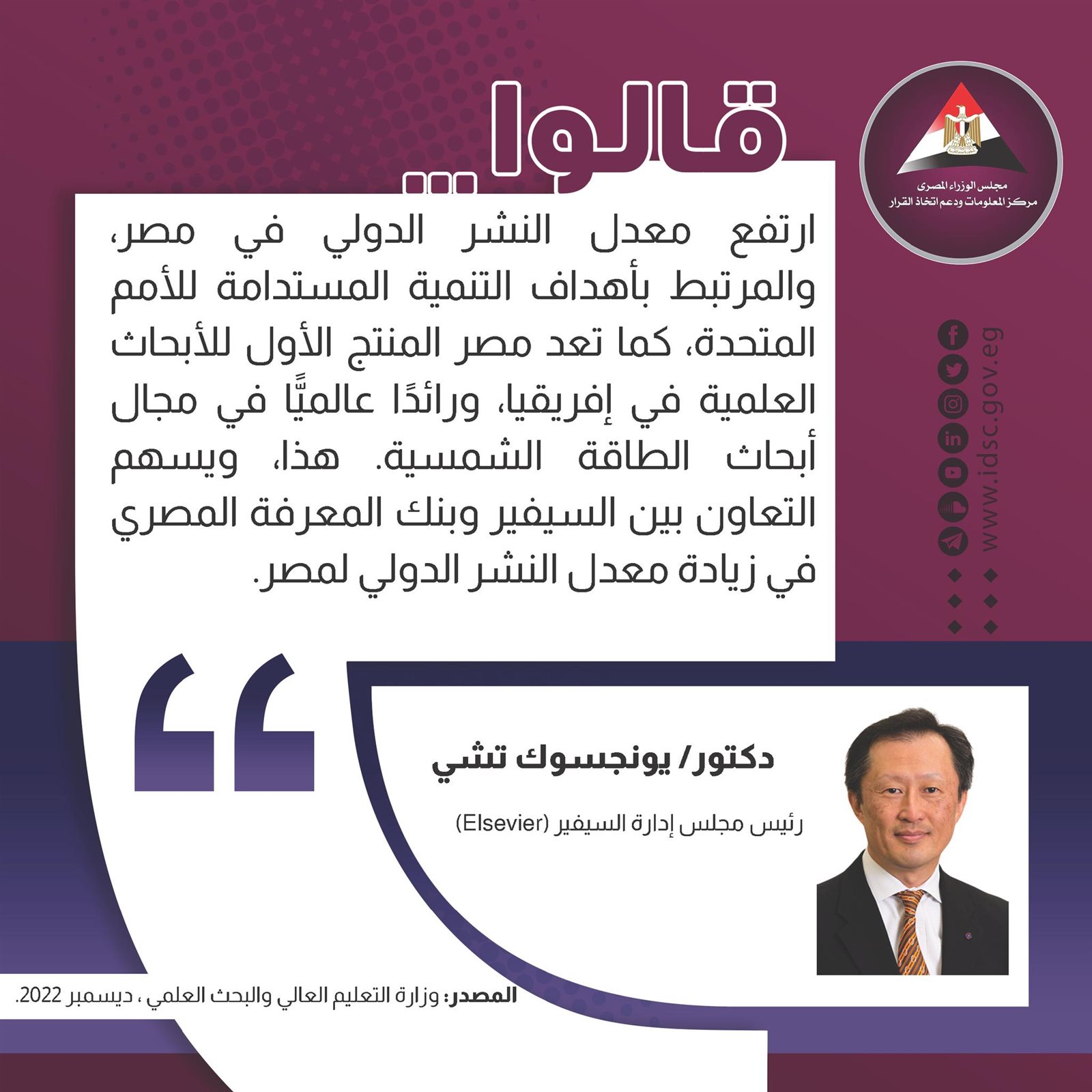 وأوضح مركز المعلومات، عبر صفحته الرسمية على موقع التواصل الاجتماعي فيسبوك، أن الدكتور يونجسوك تشي، رئيس مجلس إدارة السيفير، صرح بأنه قد ارتفع معدل النشر الدولي في مصر، والمرتبط بأهداف التنمية المستدامة للأمم المتحدة، بنسبة 17% سنويا.