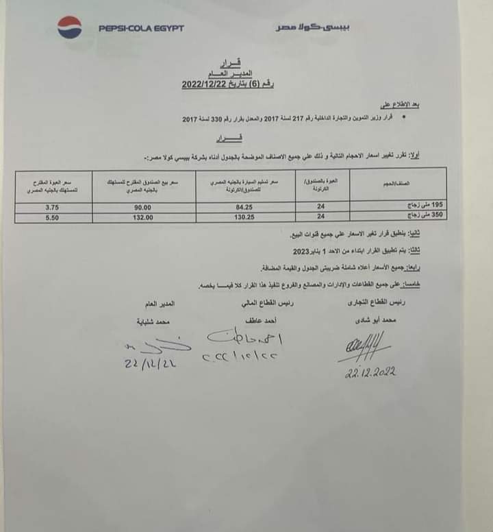 ووفق مستند رسمي من شركة بيبسي كولا مصر، التي تنتج مشروبات علامات بيبسي وبطاطس شيبسي، حصل القاهرة 24 على نسخة منه، ومرسل إلى التجار أعضاء الغرف التجارية، تم رفع سعر عبوة بيبسي 195 ملي جرام زجاج إلى 3.75 جنيه، وسعر عبوة 350 ملي جرام زجاج إلى 5.5 جنيه.
