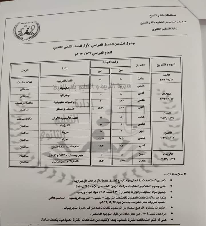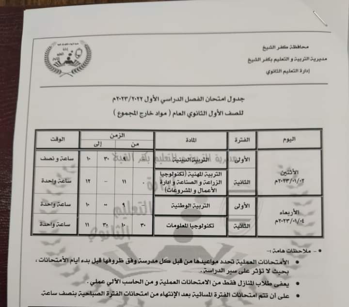 جدول امتحانات الصف الثالث الإعدادي في محافظة كفر الشيخ: