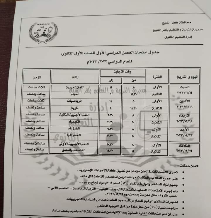 اعتمد محمد عبد الله، وكيل وزارة التربية والتعليم بمحافظة كفر الشيخ، جدول امتحانات الفصل الدراسي الأول لصفوف النقل للمراحل التعليمية المختلفة، وشهادة إتمام الدراسة لمرحلة التعليم الأساسي «الصف الثالث الإعدادي» الرسمي العام والرسمي للغات 2022/2023 م.