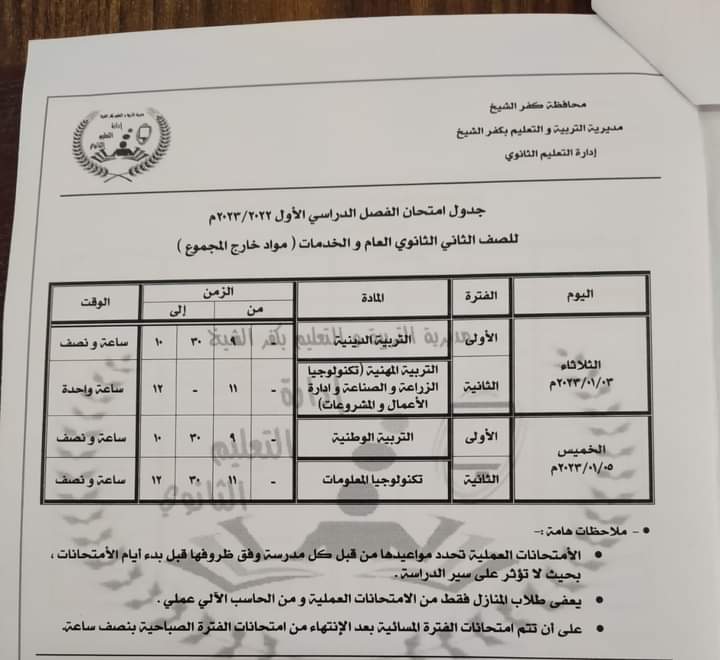 * يوم الاثنين 16 يناير 2023: مادة الدراسات الاجتماعية ومادة تكنولوجيا المعلومات والاتصالات.