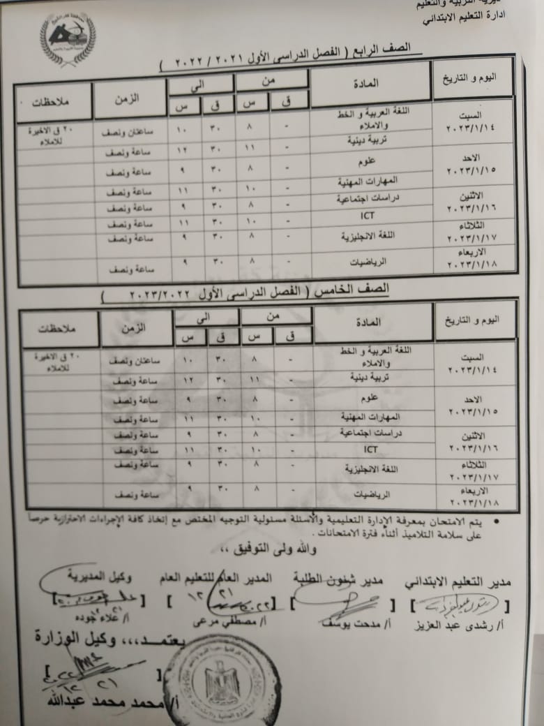 * الثلاثاء 24 يناير 2023: امتحان مادة اللغة الإنجليزية وتربية فنية.