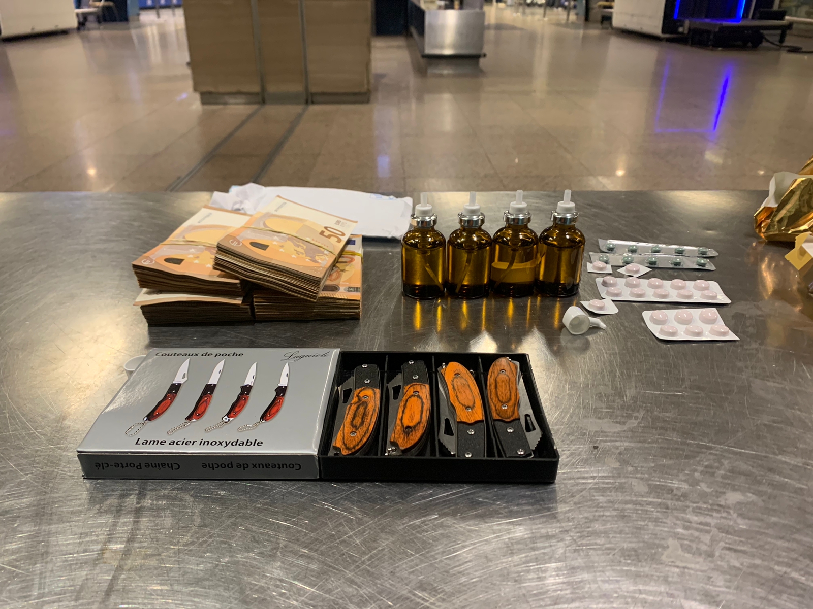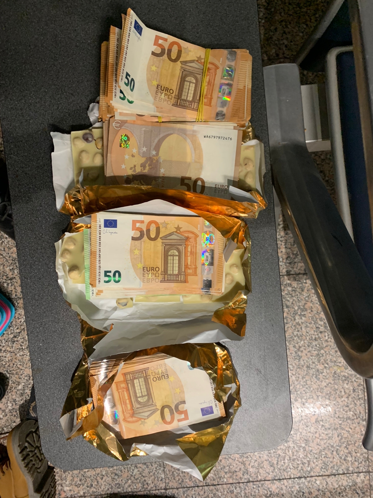 والحرز الثالث وهو الخاص بالعملة الأجنبية التي لم يفصح الراكب عنها وخبأها داخل عبوات شيكولاته وبه عشرة آلاف ومائتان وستون يورو بعد منح الراكب المبلغ المسموح به قانونا دون إافصاح وهو مبلغ 9360 يورو ما يوازي 10 ألاف دولار أمريكي.