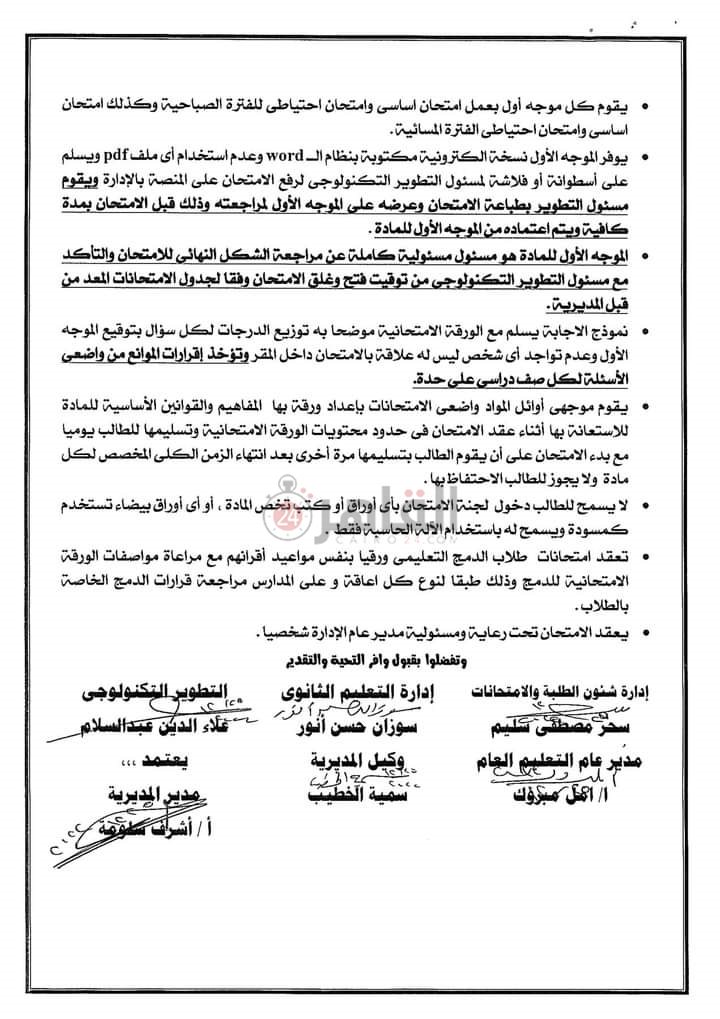وقت واحد وهو الزمن المحدد للامتحان. - في حال حدوث مشكلة تقنية فى أى مادة يتم أداء الامتحان ورقيا لهذه المادة في نفس موعد الامتحان المحدد بالجدول وعمل محضر اثبات حالة عن المسألة ووصفها وصفً دقيقًا.