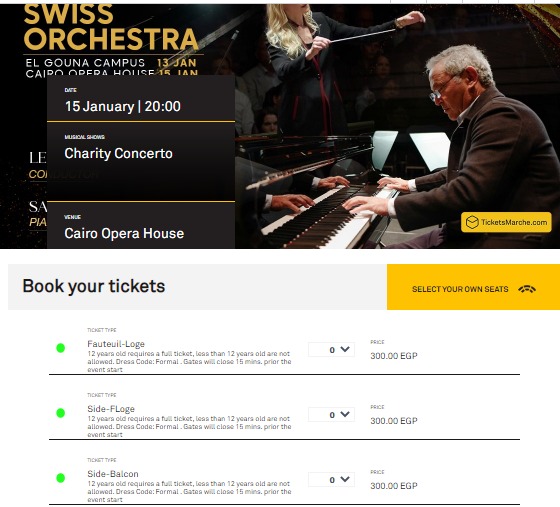 طرحت شركة تيكتس مارشيه، أسعار حفلين للمهندس ورجل الأعمال سميح ساويرس كعازف للبيانو مع أوركسترا السيمفوني السويسري في دار الأوبرا المصرية ومدينة الجونة، وذلك خلال شهر يناير القادم.