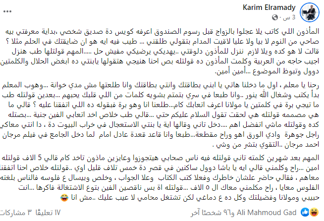بعد انتشار أخبار القبض علي المأذون المزيف، تداول أحد رواد مواقع التواصل الاجتماعي فيسبوك يدعى كريم، يعمل محاميا، متزوج قصة حدثت مع المأذون خلال خلافات أسرية بينه وبين زوجته: المأذون اللي كاتب يلا عجلوا بالزواج قبل رسوم الصندوق أعرفه كويس، ده صديق شخصي، بداية معرفتي بيه صاحي من النوم لا بيا ولا عليا لقيت المدام بتقولي طلقني، طيب فيه إيه هو أنا ضايقتك في الحلم مثلا؟، قالت لا هو كده ويلا لازم ننزل للمأذون دلوقتي، يهديكي يرضيكي مفيش حل.. المهم قولتلها طب هنزل أجيب حاجة من العربية وكلمت المأذون ده قولتله بص إحنا هنيجي هتقولها يابنتي ده أبغض الحلال والكلمتين دول وتبوظ الموضوع.