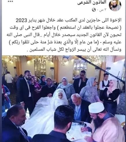 وقررت محكمة أسرة عابدين إيقاف المأذون محمد محمد درويش مصطفى، عن العمل وسحب دفاتر الزواج والطلاق منه والتحقيق مع مساعده ياسر القرشي بسبب نشرهما منشورات على فيسبوك لحث المواطنين على الزواج قبل صدور قانون الأحوال الشخصية الجديد حتى لا يدفعون 30 ألف جنيه للصندوق.