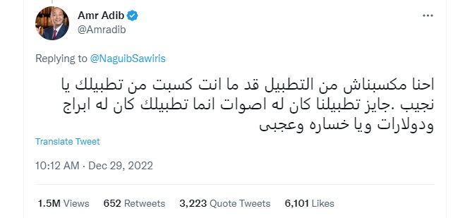 ورد عمرو أديب أيضًا على نجيب ساويرس من خلال تغريده له قائلًا: احنا مكسبناش من التطبيل قد ما أنت كسبت من تطبيلك يا نجيب.. جايز تطبيلنا كان له اصوات انما تطبيلك كان له ابراج ودولارات ويا خساره وعجبى”.