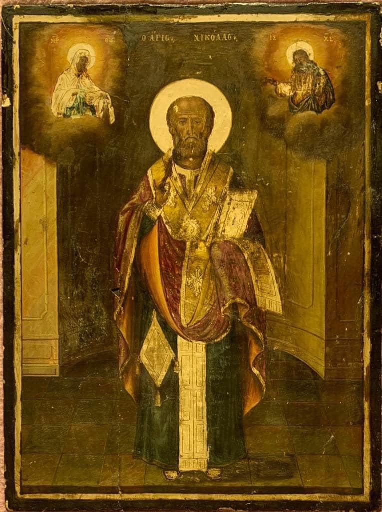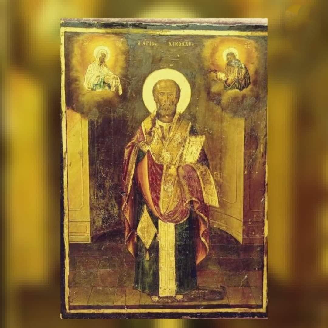 أما عن صاحب الأيقونة المصنوعة من الخشب الملون فهو القديس الأنبا نيقولاوس أسقف مورا وهي إحدى مقاطعات آسيا الصغرى أو الأناضول «تركيا حاليًا» ومسقط رأسه وكان والده يدعى ابيفانيوس وتدعى والدته تونة وصوره الفنان واقفًا متخذًا أحد الأوضاع الشهيرة التي دائمًا ما يصور بها السيد المسيح وحول رأسه هالة من النور علامة القداسة وعلى جانبي الصورة من الأعلى صور الفنان السيد المسيح والسيدة العذراء مريم كنوع من التأييد ومنح البركة للقديس.