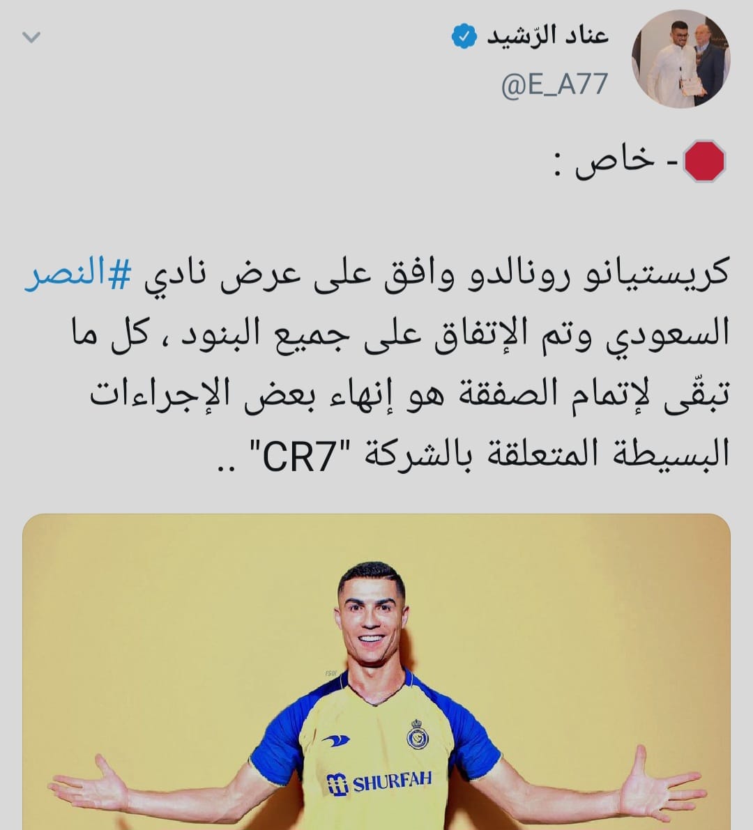 بينما قال الصحفي السعودي عناد الرشيد عبر حسابه الرسمي على موقع التواصل الاجتماعي تويتر: كريستيانو رونالدو وافق على عرض نادي النصر السعودي وتم الإتفاق على جميع البنود، كل ما تبقّى لإتمام الصفقة هو إنهاء بعض الإجراءات البسيطة المتعلقة بالشركة.