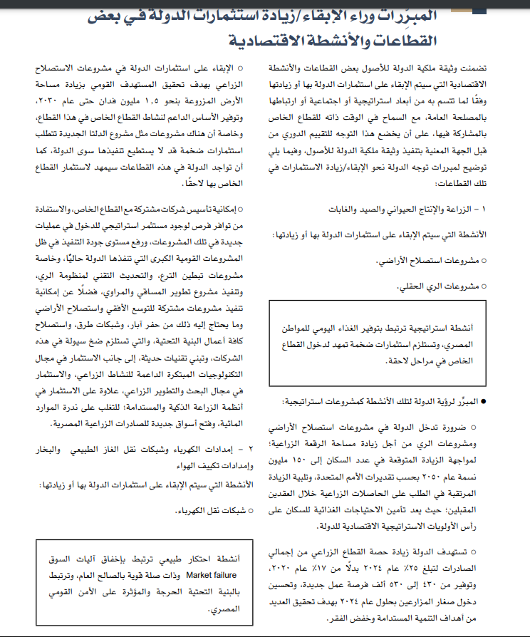 ضرورة تدخل الدولة في مشروعات استصلاح الأراضي ومشروعات الري من أجل زيادة مساحة الرقعة الزراعية لمواجهة الزيادة المتوقعة في عدد السكان إلى 150 مليون نسمة عام 2050 بحسب تقديرات الأمم المتحدة، وتلبية الزيادة المرتقبة في الطلب على الحاصلات الزراعية خلال العقدين المقبلين حيث يعد تأمين الاحتياجات الغذائية للسكان على رأس الأولويات الاستراتيجية الاقتصادية للدولة.