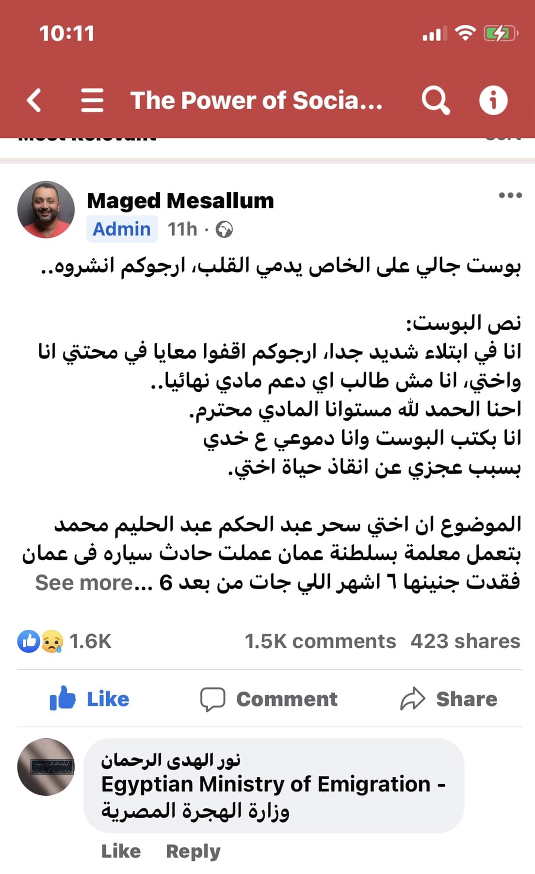 وتابع حجاجي عبد الحكم عبد الحليم محمد، عبر استغاثته التي نشرها على موقع التواصل الاجتماعي فيسبوك: اختي بتموت وحرارتها 40 مبتنزلش، أتوسل إليكم توصلوا صوتي لوزيرة الهجرة وللمسئولين في مصر لنقلها إلى المستشفى السلطاني، في مسقط أو مستشفى الجامعة في عمان على نفقتنا الشخصية، لأن إمكانيتها أكبر وده آخر أمل لنا بعد لطف الله.