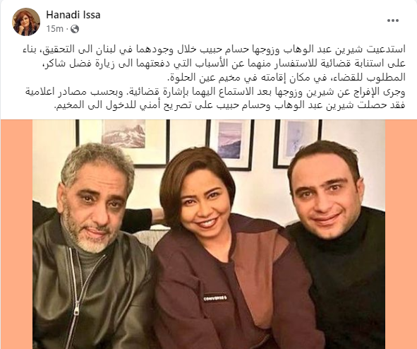 وكتبت هنادي عيسى على حسابها الشخصي بـ فيس بوك: استدعيت شيرين عبد الوهاب وزوجها حسام حبيب خلال وجودهما في لبنان إلى التحقيق، وبناءً على استنابة قضائية للاستفسار منهما عن الأسباب التي دفعتهما إلى زيارة فضل شاكر المطلوب للقضاء، في مكان إقامته في مخيم عين الحلوة.